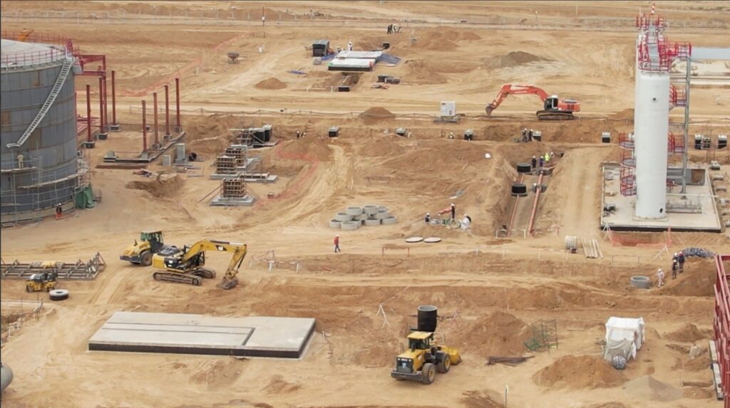 — Выполняются работы по бетонированию фундаментов, монтажу и покраске металлоконструкций и обслуживающих площадок, установке и обвязке технологического оборудования, а также сборка резервуаров типов РВС-5000 и сферических резервуаров объёмом 600 м³;